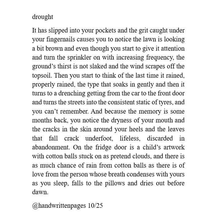 It has slipped into your pockets and the grit caught under your fingernails causes you to notice the lawn is looking a bit brown and even though you start to give it attention and turn the sprinkler on with increasing frequency, the ground’s thirst is not slaked and the wind scrapes off the topsoil. Then you start to think of the last time it rained, properly rained, the type that soaks in gently and then it turns to a drenching getting from the car to the front door and turns the streets into the consistent static of tyres, and you can’t remember. And because the memory is some months back, you notice the dryness of your mouth and the cracks in the skin around your heels and the leaves that fall crack underfoot, lifeless, discarded in abandonment. On the fridge door is a child’s artwork with cotton balls stuck on as pretend clouds, and there is as much chance of rain from cotton balls as there is of love from the person whose breath condenses with yours as you sleep, falls to the pillows and dries out before dawn.