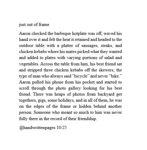 Aaron checked the barbeque hotplate was off, waved his hand over it and felt the heat it retained and headed to the outdoor table with a platter of sausages, steaks, and chicken kebabs where his mates picked what they wanted and added to plates with varying portions of salad and vegetables. Across the table from him, his best friend sat and stripped three chicken kebabs off the skewers; the type of man who always said “bicycle” and never “bike.” Aaron pulled his phone from his pocket and started to scroll through the photo gallery looking for his best friend. There was heaps of photos from backyard get togethers, gigs, some holidays, and in all of them, he was on the edges of the frame or hidden behind another person. Someone who meant so much to him was never fully there in the record of their friendship.