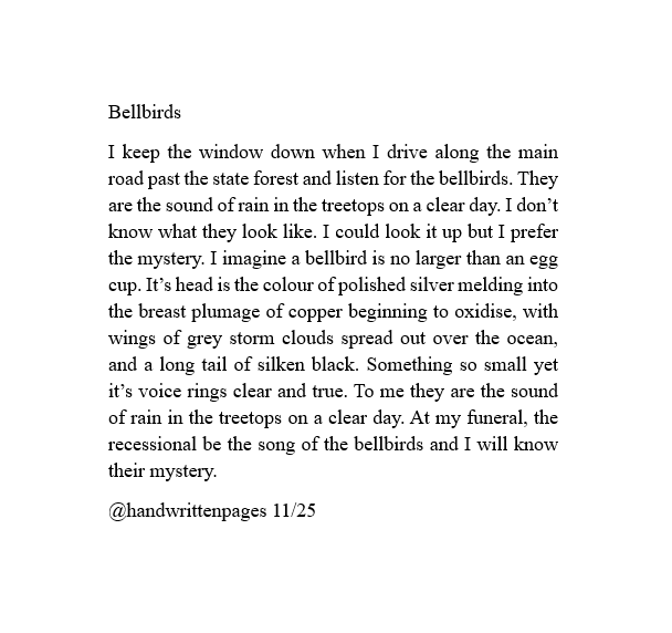 I keep the window down when I drive along the main road past the state forest and listen for the bellbirds. They are the sound of rain in the treetops on a clear day. I don’t know what they look like. I could look it up but I prefer the mystery. I imagine a bellbird is no larger than an egg cup. It’s head is the colour of polished silver melding into the breast plumage of copper beginning to oxidise, with wings of grey storm clouds spread out over the ocean, and a long tail of silken black. Something so small yet it’s voice rings clear and true. To me they are the sound of rain in the treetops on a clear day. At my funeral, the recessional be the song of the bellbirds and I will know their mystery.