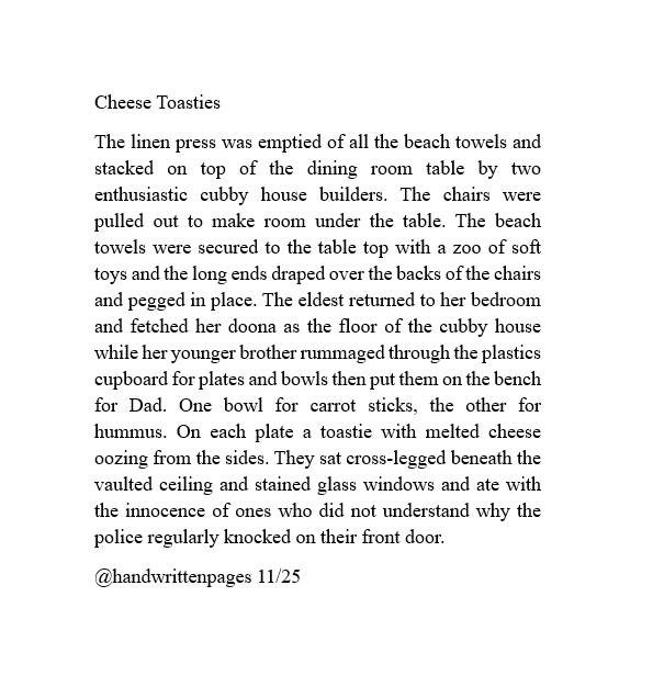The linen press was emptied of all the beach towels and stacked on top of the dining room table by two enthusiastic cubby house builders. The chairs were pulled out to make room under the table. The beach towels were secured to the table top with a zoo of soft toys and the long ends draped over the backs of the chairs and pegged in place. The eldest returned to her bedroom and fetched her doona as the floor of the cubby house while her younger brother rummaged through the plastics cupboard for plates and bowls then put them on the bench for Dad. One bowl for carrot sticks, the other for hummus. On each plate a toastie with melted cheese oozing from the sides. They sat cross-legged beneath the vaulted ceiling and stained glass windows and ate with the innocence of ones who did not understand why the police regularly knocked on their front door.