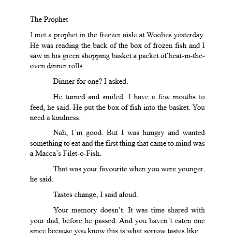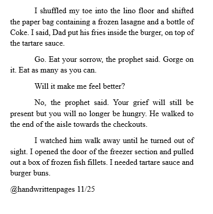 I shuffled my toe into the lino floor and shifted the paper bag containing a frozen lasagne and a bottle of Coke. I said, Dad put his fries inside the burger, on top of the tartare sauce.