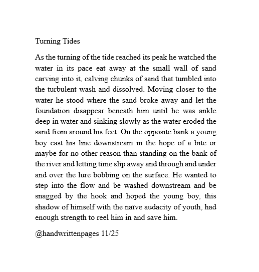 As the turning of the tide reached its peak he watched the water in its pace eat away at the small wall of sand carving into it, calving chunks of sand that tumbled into the turbulent wash and dissolved. Moving closer to the water he stood where the sand broke away and let the foundation disappear beneath him until he was ankle deep in water and sinking slowly as the water eroded the sand from around his feet. On the opposite bank a young boy cast his line downstream in the hope of a bite or maybe for no other reason than standing on the bank of the river and letting time slip away and through and under and over the lure bobbing on the surface. He wanted to step into the flow and be washed downstream and be snagged by the hook and hoped the young boy, this shadow of himself with the naïve audacity of youth, had enough strength to reel him in and save him.