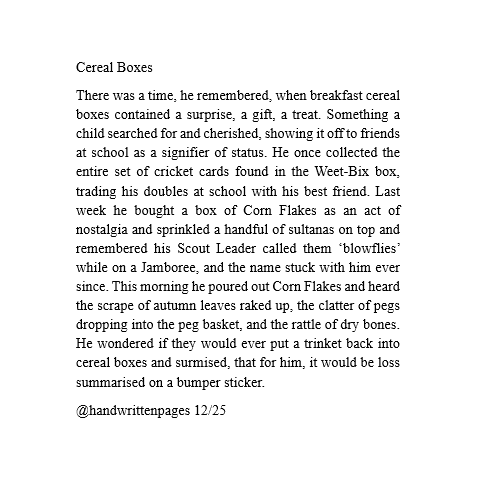 There was a time, he remembered, when breakfast cereal boxes contained a surprise, a gift, a treat. Something a child searched for and cherished, showing it off to friends at school as a signifier of status. He once collected the entire set of cricket cards found in the Weet-Bix box, trading his doubles at school with his best friend. Last week he bought a box of Corn Flakes as an act of nostalgia and sprinkled a handful of sultanas on top and remembered his Scout Leader called them ‘blowflies’ while on a Jamboree, and the name stuck with him ever since. This morning he poured out Corn Flakes and heard the scrape of autumn leaves raked up, the clatter of pegs dropping into the peg basket, and the rattle of dry bones. He wondered if they would ever put a trinket back into cereal boxes and surmised, that for him, it would be loss summarised on a bumper sticker.