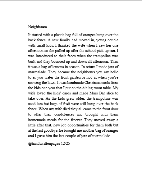 It started with a plastic bag full of oranges hung over the back fence. A new family had moved in, young couple with small kids. I thanked the wife when I saw her one afternoon as she pulled up after the school pick up run. I was introduced to their faces when the trampoline was built and they bounced up and down all afternoon. Then it was a bag of lemons in season. In return I made jars of marmalade. They became the neighbours you say hello to as you water the front garden or nod at when you’re mowing the lawn. It was handmade Christmas cards from the kids one year that I put on the dining room table. My wife loved the kids’ cards and made Mars Bar slice to take over. As the kids grew older, the trampoline was used less but bags of fruit were still hung over the back fence. When my wife died they all came to the front door to offer their condolences and brought with them homemade meals for the freezer. They moved away a little after that, new job opportunities for them both but at the last goodbye, he brought me another bag of oranges and I gave him the last couple of jars of marmalade.