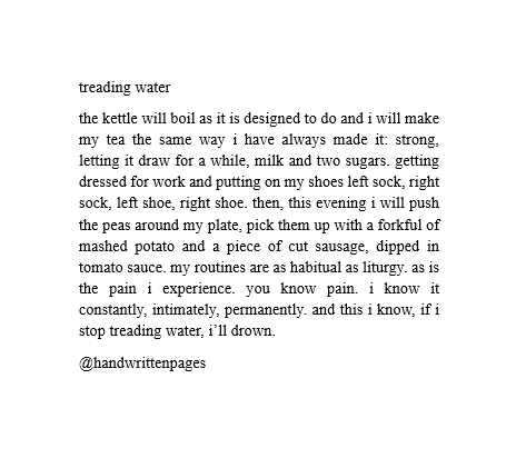 the kettle will boil as it is designed to do and i will make my tea the same way i have always made it: strong, letting it draw for a while, milk and two sugars. getting dressed for work and putting on my shoes left sock, right sock, left shoe, right shoe. then, this evening i will push the peas around my plate, pick them up with a forkful of mashed potato and a piece of cut sausage, dipped in tomato sauce. my routines are as habitual as liturgy. as is the pain i experience. you know pain. i know it constantly, intimately, permanently. and this i know, if i stop treading water, i’ll drown.