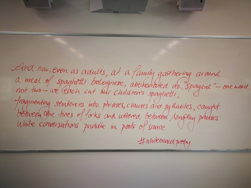 The temporality of whiteboards and their content, known to me as a teacher, also makes a great canvas or notepad. I can write on it, amend, and take a photo to preserve it then erase it as if it never existed.