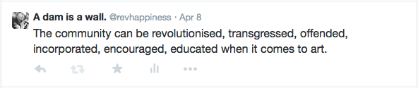While away on holidays the thought of the ubiquitious selfie struck me as an indicative misunderstanding of the way art functions in society.  Without giving it too much thought I put the random thoughts to twitter.Screen Shot 2015-04-16 at 9.37.14 pm