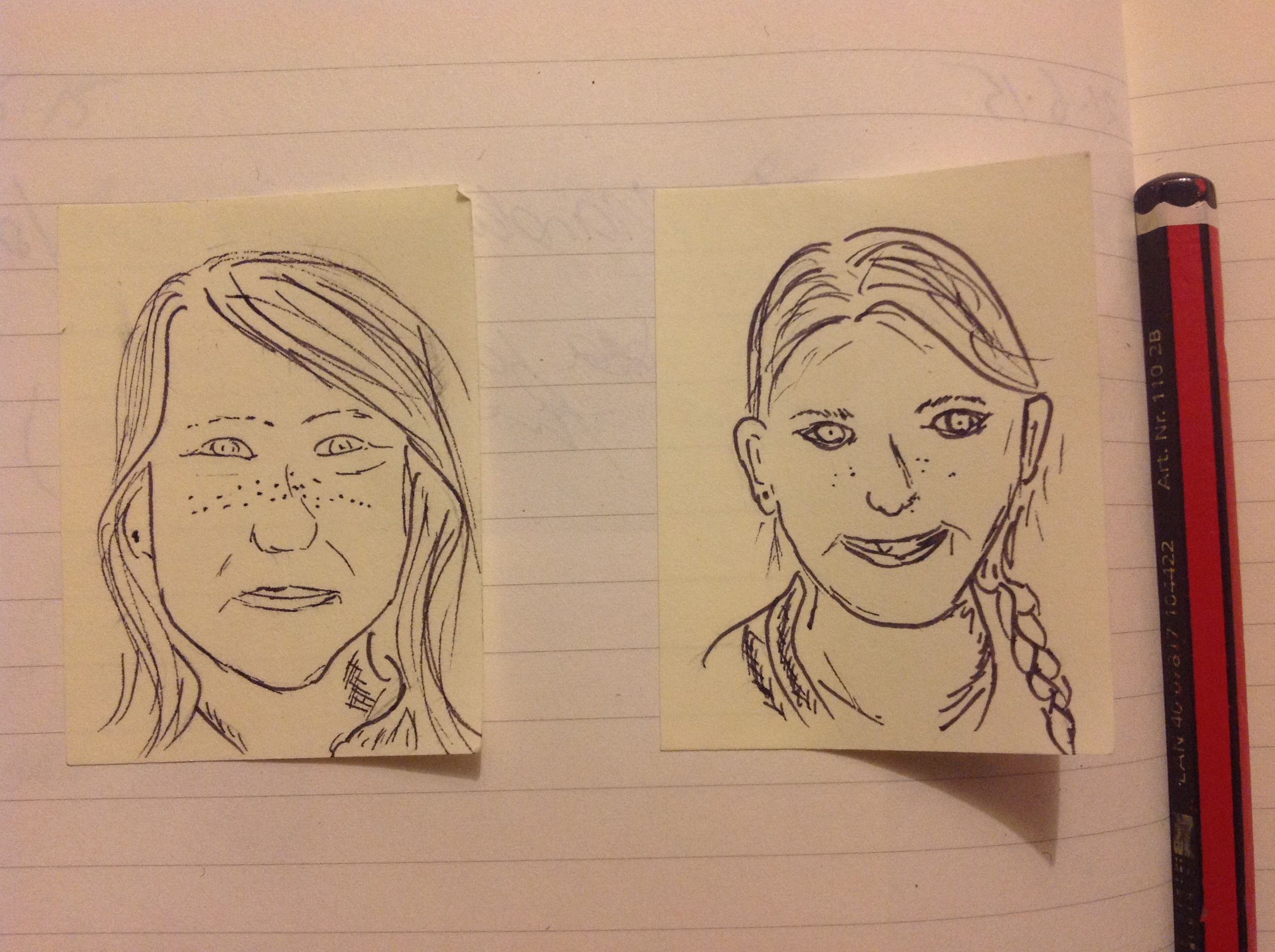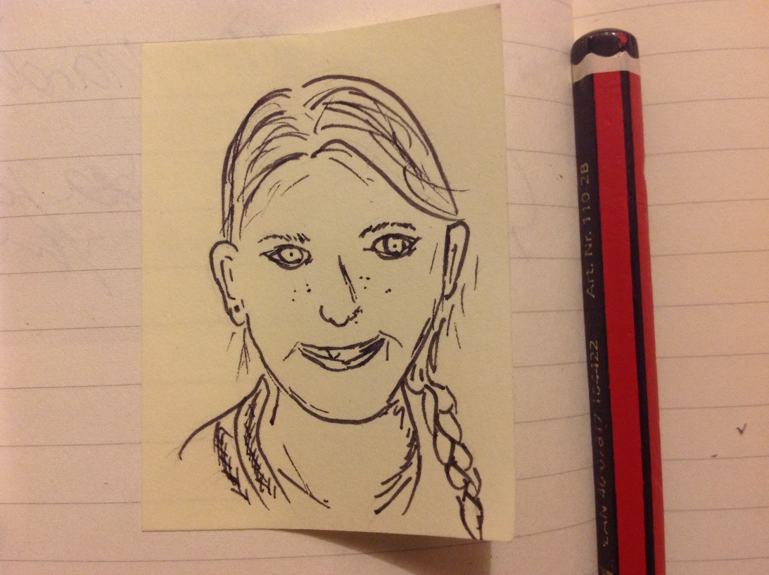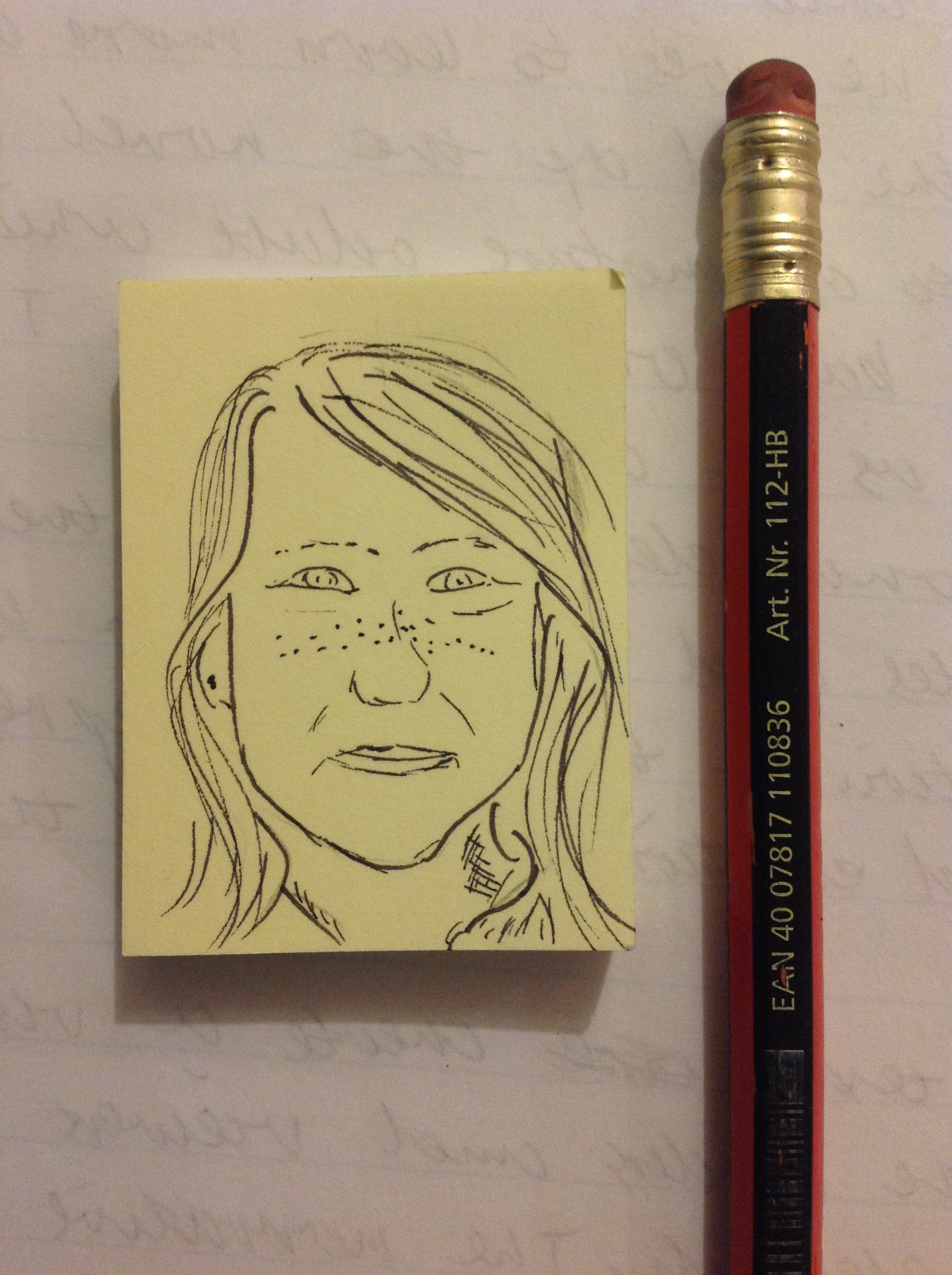 Speaking of distractions, on a whim the other night I opened my iPad, found a picture of my daughter (Miss #2) and attempted to draw it on a tiny Post It Note (the pencil gives you an idea of the scale).