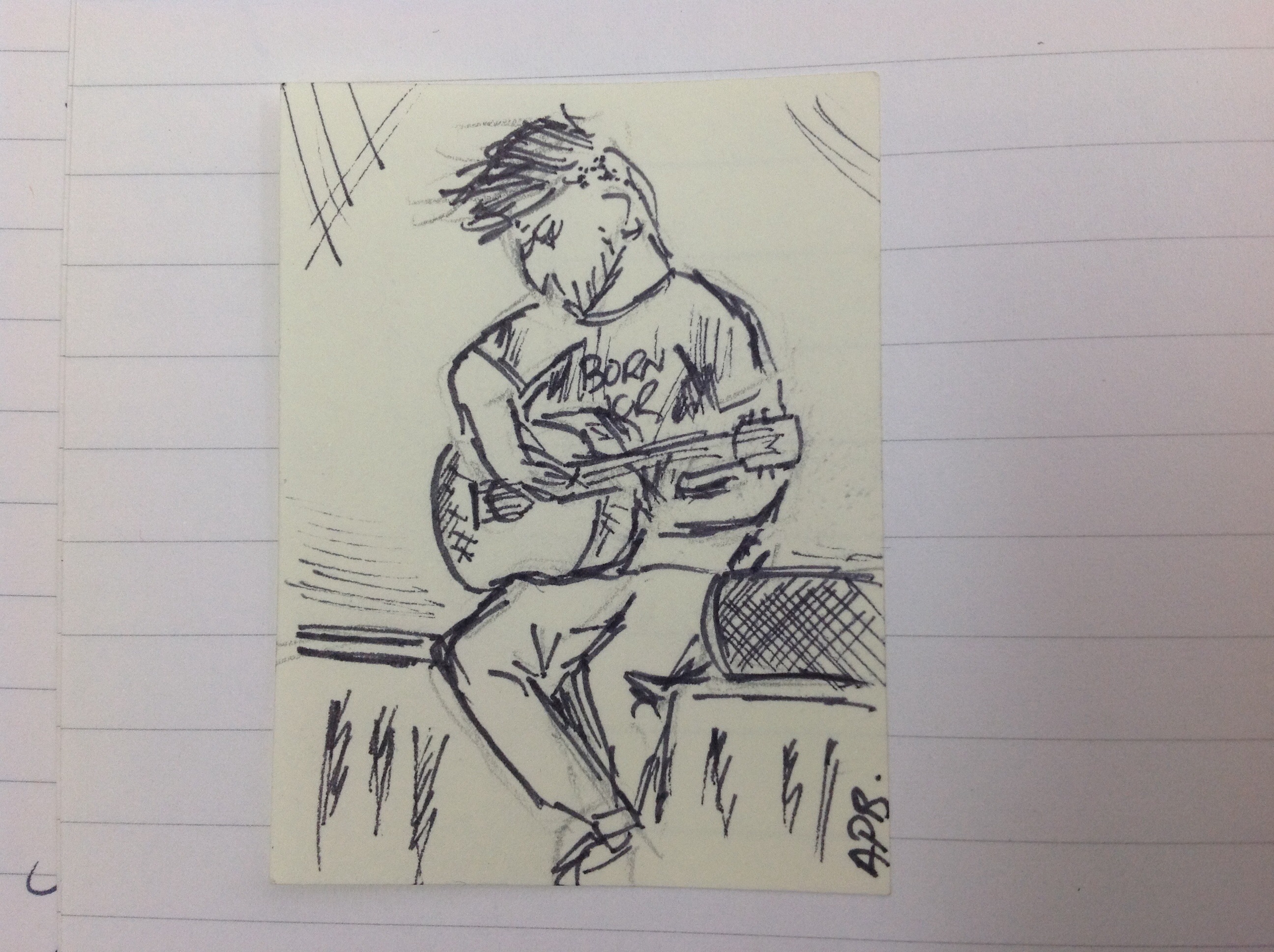 Unperturbed, I took my pencil and pen to band practice and sketched one of the guitarists during set up and sound check. The proportion is wrong, but it’s not bad.