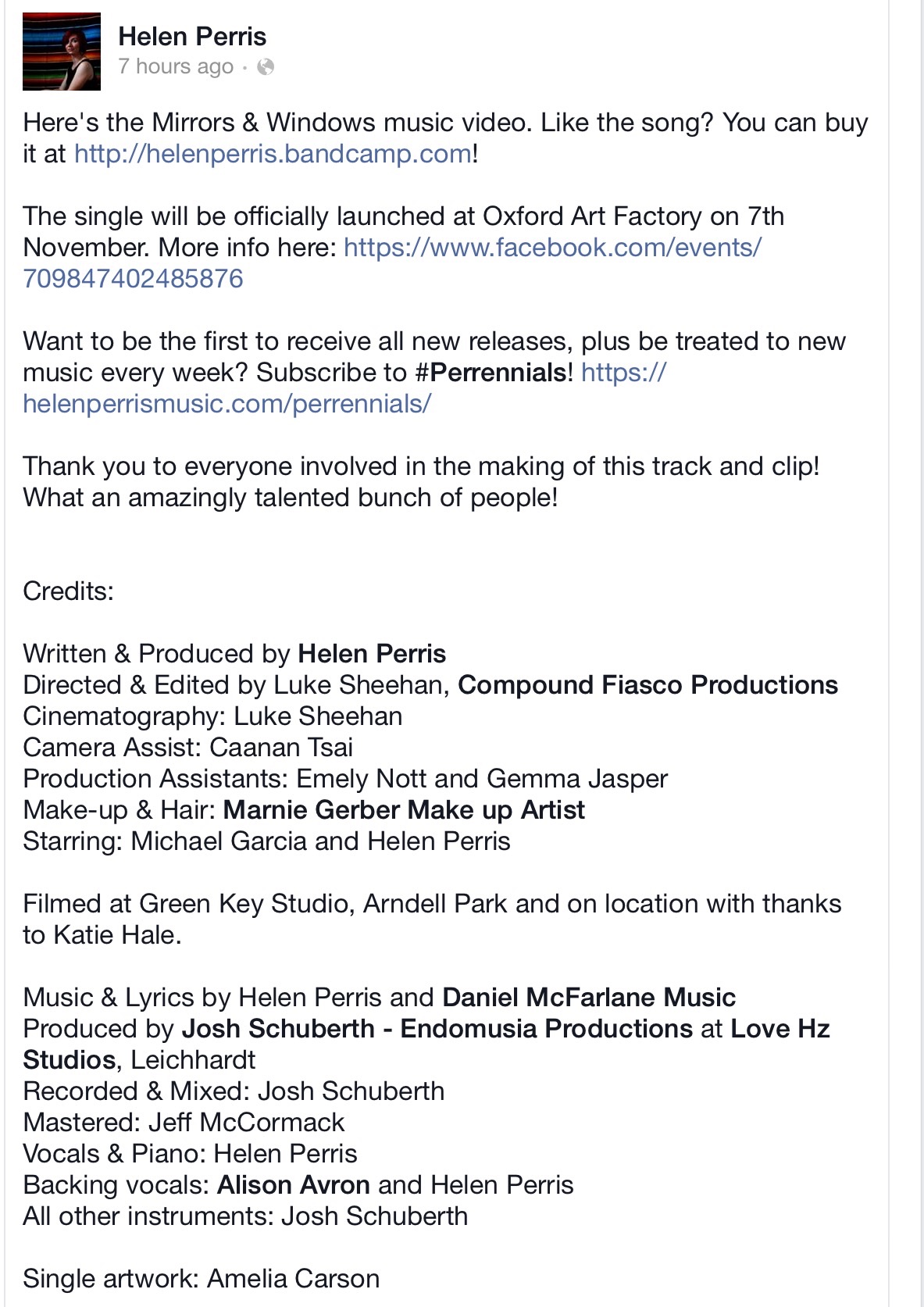 Today, local Sydney artist, Helen Perris releases her new song, Mirrors and Windows. I really like this song. Lovely production. It has a pop sensibility with reference to Helen’s influences in cabaret and musical theatre. Think Amanda Palmer, Tori Amos, Kate Bush. All lovely stuff.