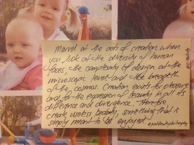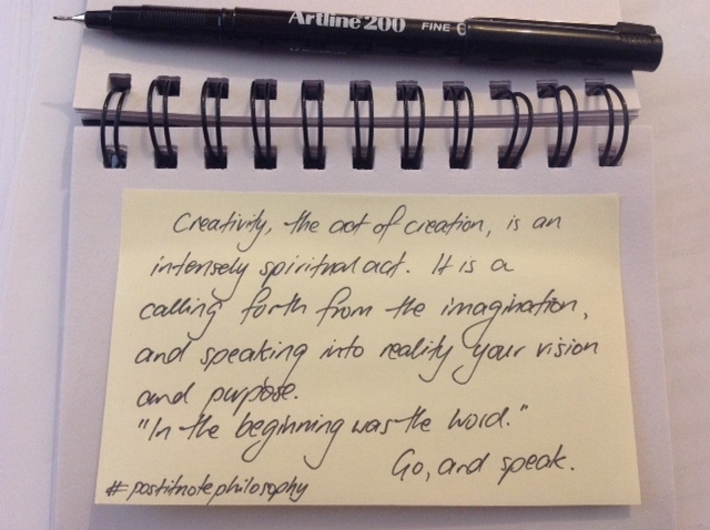I firmly believe in the creative dynamic is a part of everyone’s life; it is not the sole domain of the writer, the artist or the musician, the film maker or dancer. Therefore for the month of September I will post a Post It Note with a statement about creativity. It will be an exploration of what I believe creativity is, and how it can be a dynamic part of everyone’s existence.