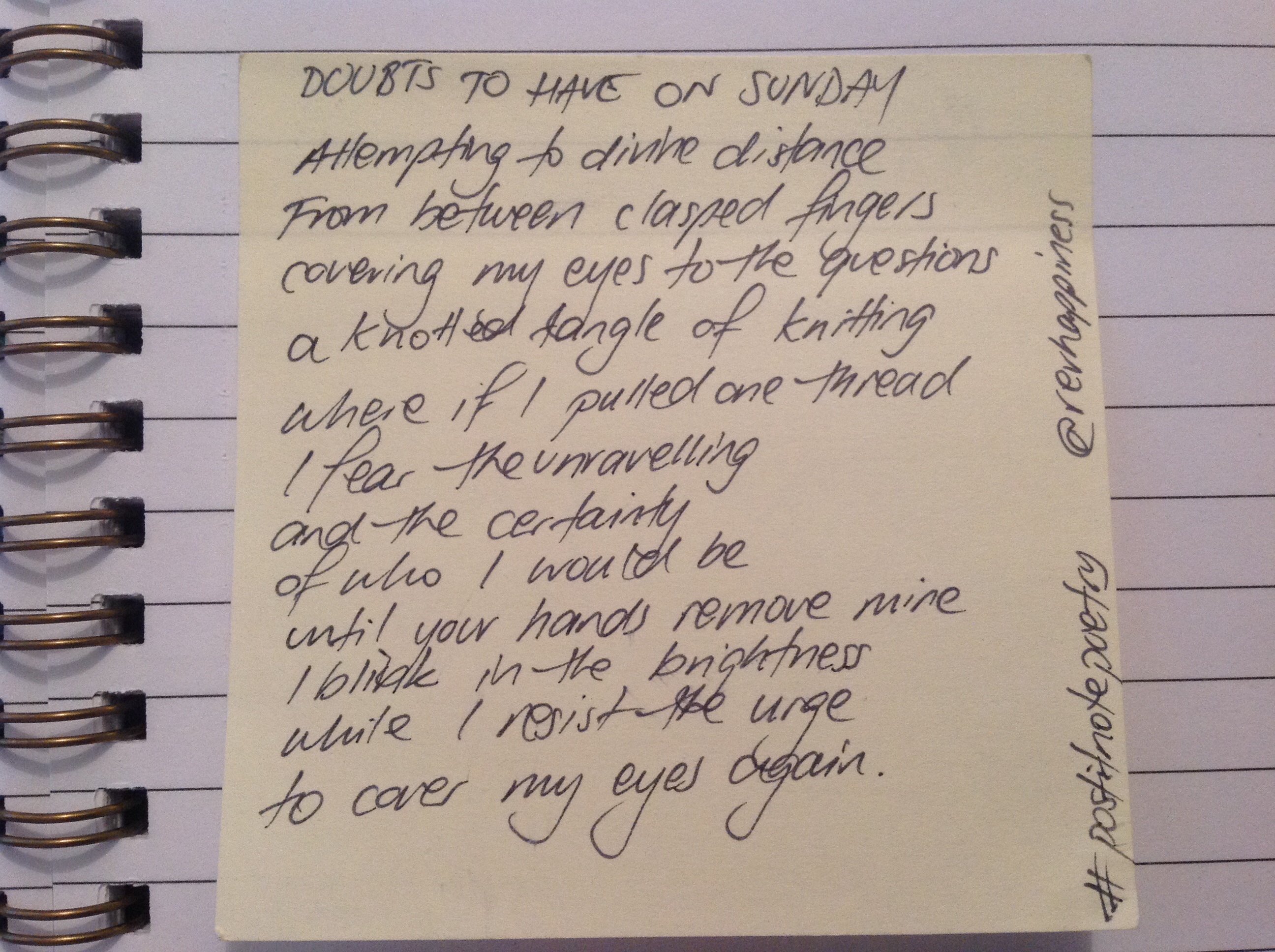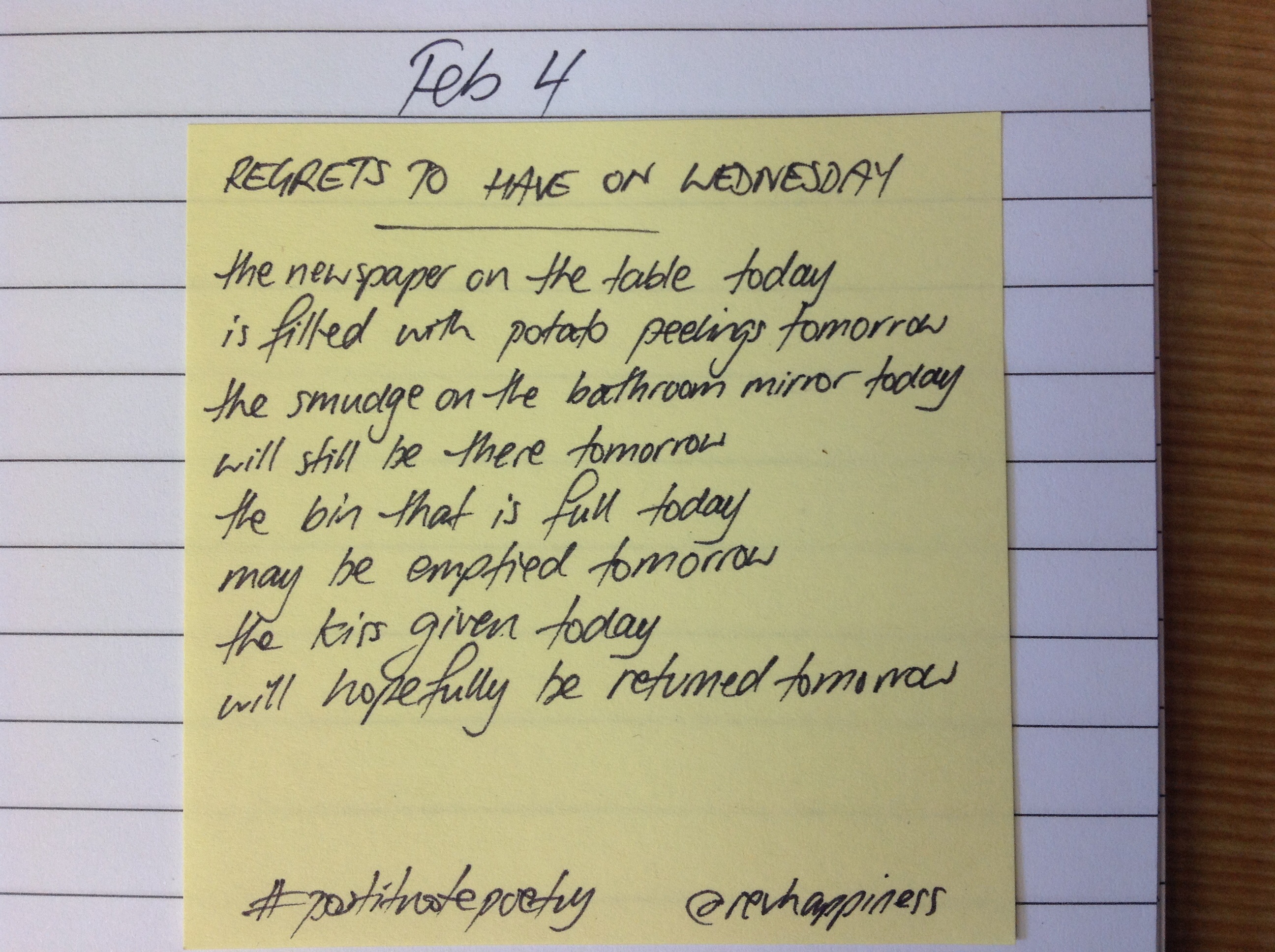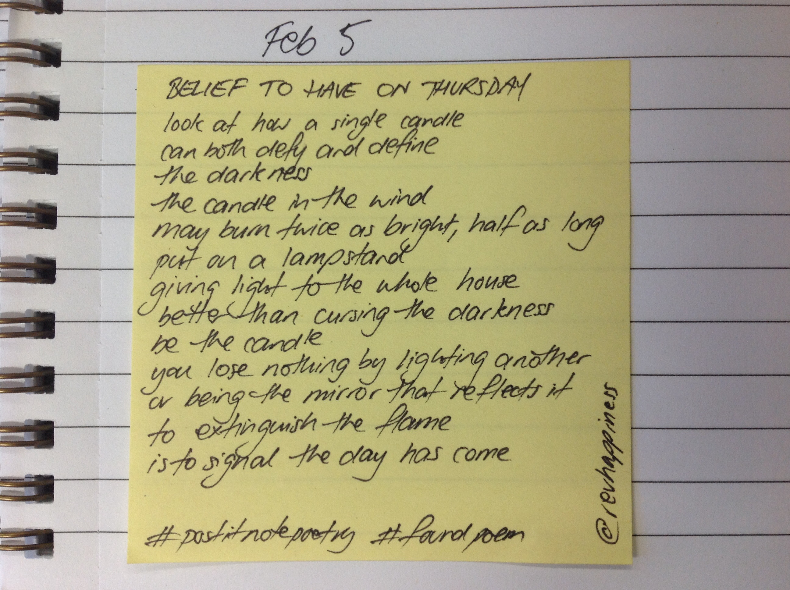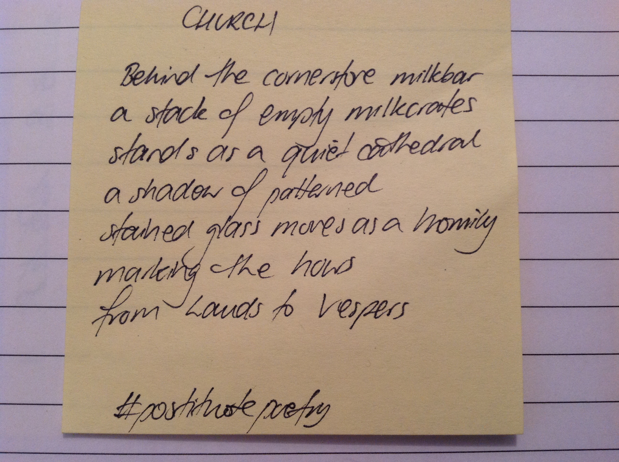 But here’s the challenge: why don’t you have a go? Grab a packet of Post It Notes (any colour will do) and write a poem each day. Post it to twitter and include the hashtag. Include me too (@revhappiness) so I can see what’s going on.