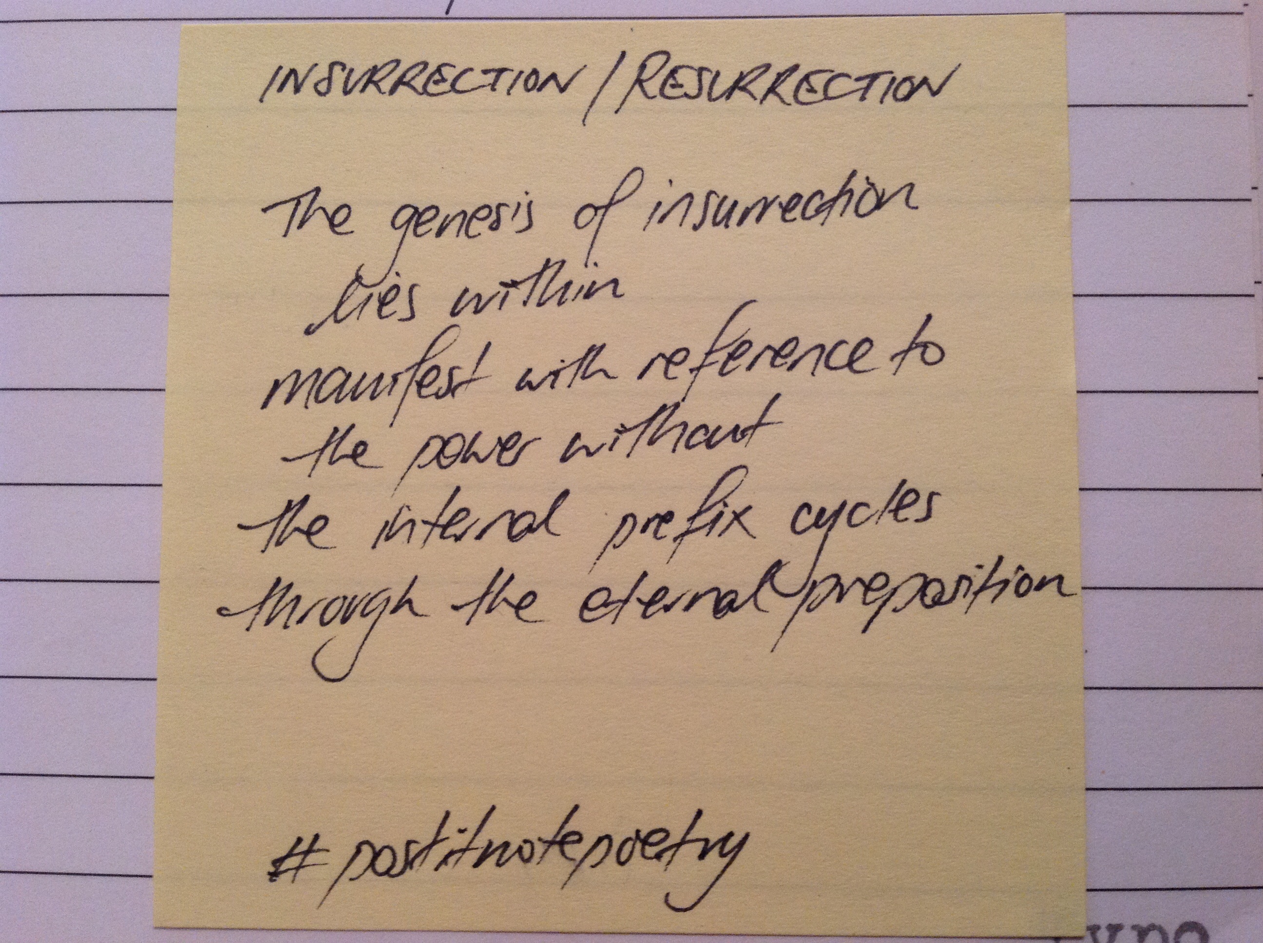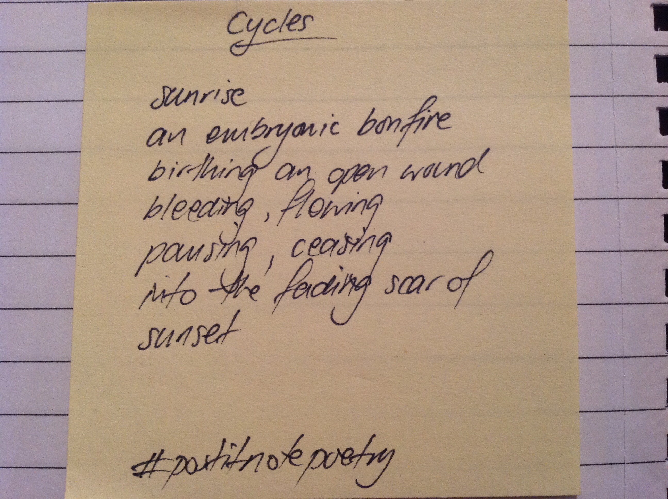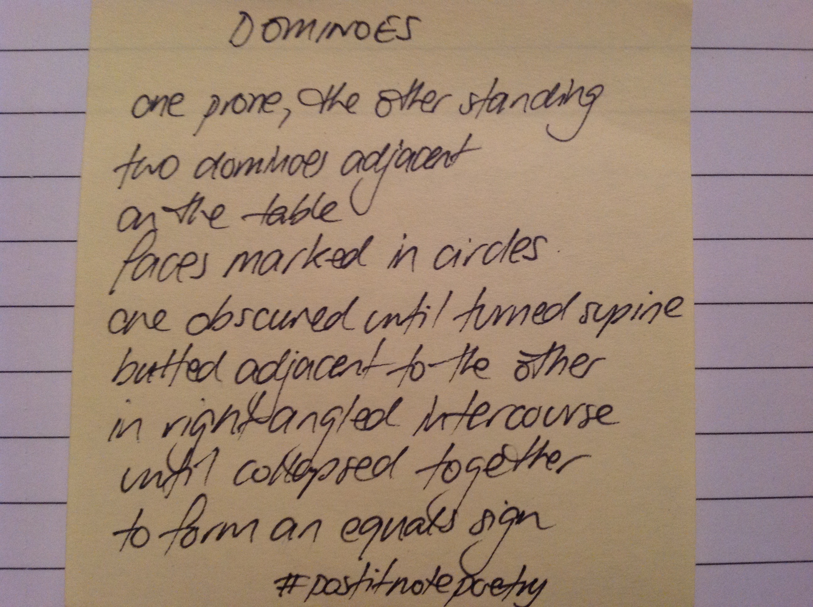 You can find my collection of Post It Note Poetry over on tumblr as well as some other poetry including blackout/erasure poetry.