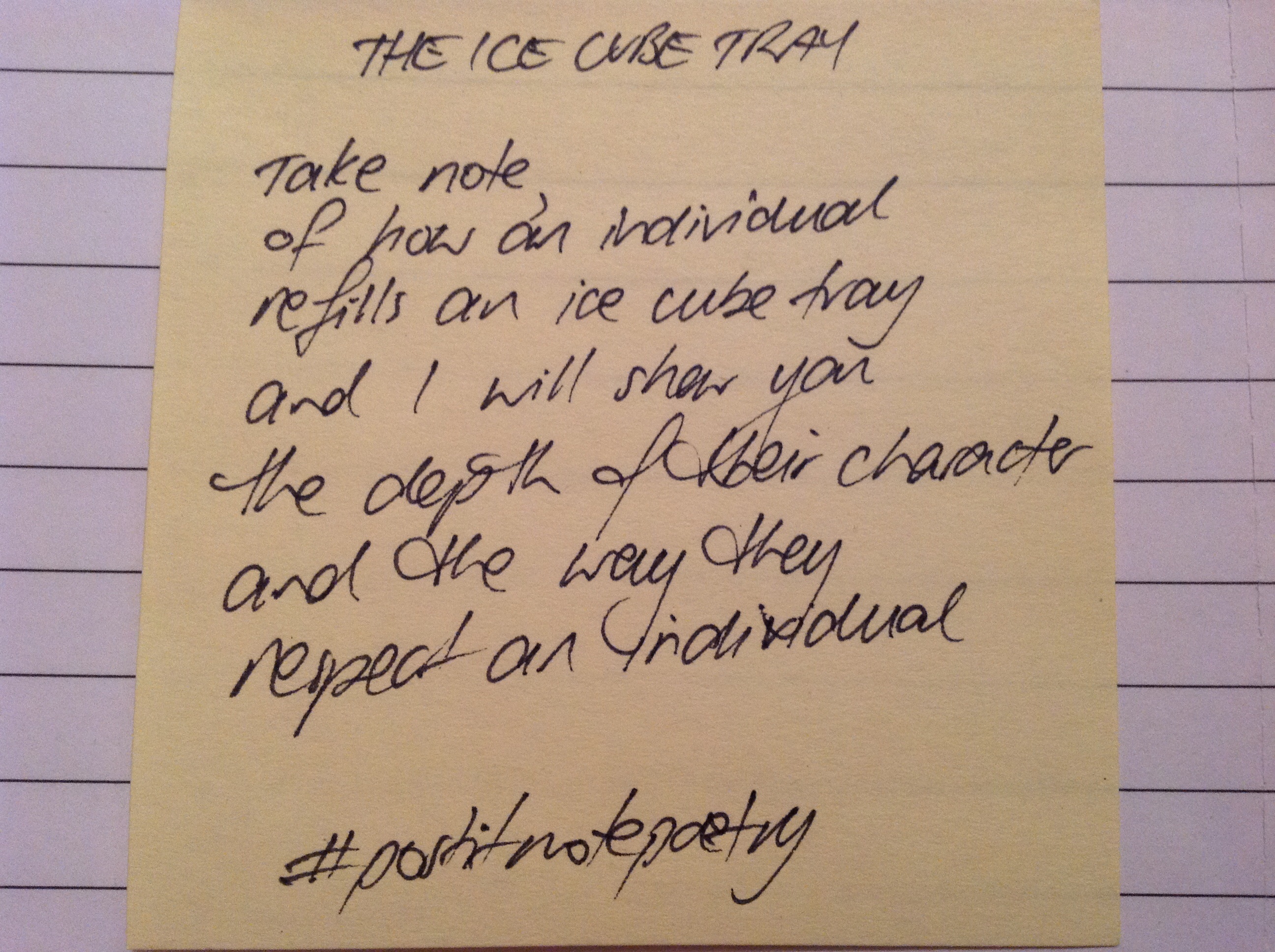 Another line from my notebook, sparked by one time when I was filling the ice cube tray. Sometimes I fill it cube by cube; other times I cascade the water until it is full. What does that say about my character?