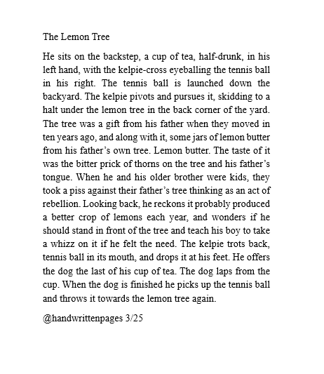He sits on the backstep, a cup of tea, half-drunk, in his left hand, with the kelpie-cross eyeballing the tennis ball in his right. The tennis ball is launched down the backyard. The kelpie pivots and pursues it, skidding to a halt under the lemon tree in the back corner of the yard. The tree was a gift from his father when they moved in ten years ago, and along with it, some jars of lemon butter from his father’s own tree. Lemon butter. The taste of it was the bitter prick of thorns on the tree and his father’s tongue. When he and his older brother were kids, they took a piss against their father’s tree thinking as an act of rebellion. Looking back, he reckons it probably produced a better crop of lemons each year, and wonders if he should stand in front of the tree and teach his boy to take a whizz on it if he felt the need. The kelpie trots back, tennis ball in its mouth, and drops it at his feet. He offers the dog the last of his cup of tea. The dog laps from the cup. When the dog is finished he picks up the tennis ball and throws it towards the lemon tree again.