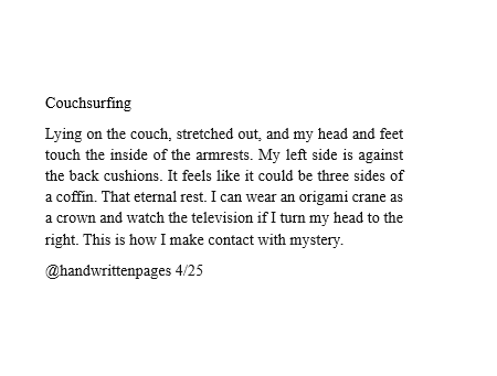 Lying on the couch, stretched out, and my head and feet touch the inside of the armrests. My left side is against the back cushions. It feels like it could be three sides of a coffin. That eternal rest. I can wear an origami crane as a crown and watch the television if I turn my head to the right. This is how I make contact with mystery.