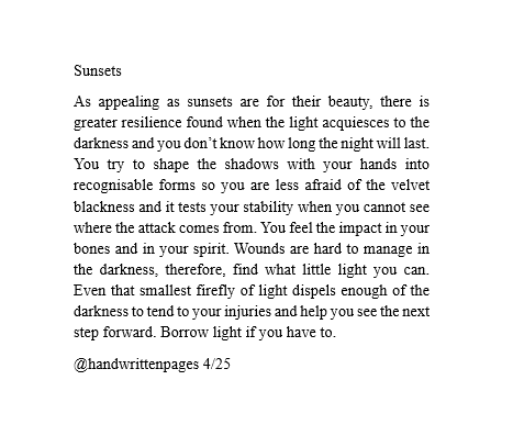 As appealing as sunsets are for their beauty, there is greater resilience found when the light acquiesces to the darkness and you don’t know how long the night will last. You try to shape the shadows with your hands into recognisable forms so you are less afraid of the velvet blackness and it tests your stability when you cannot see where the attack comes from. You feel the impact in your bones and in your spirit. Wounds are hard to manage in the darkness, therefore, find what little light you can. Even that smallest firefly of light dispels enough of the darkness to tend to your injuries and help you see the next step forward. Borrow light if you have to.