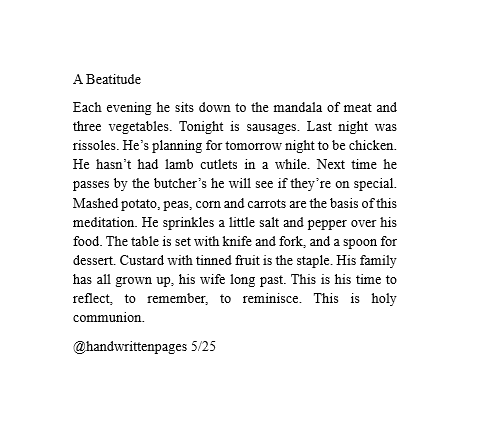 Each evening he sits down to the mandala of meat and three vegetables. Tonight is sausages. Last night was rissoles. He’s planning for tomorrow night to be chicken. He hasn’t had lamb cutlets in a while. Next time he passes by the butcher’s he will see if they’re on special. Mashed potato, peas, corn and carrots are the basis of this meditation. He sprinkles a little salt and pepper over his food. The table is set with knife and fork, and a spoon for dessert. Custard with tinned fruit is the staple. His family has all grown up, his wife long past. This is his time to reflect, to remember, to reminisce. This is holy communion.