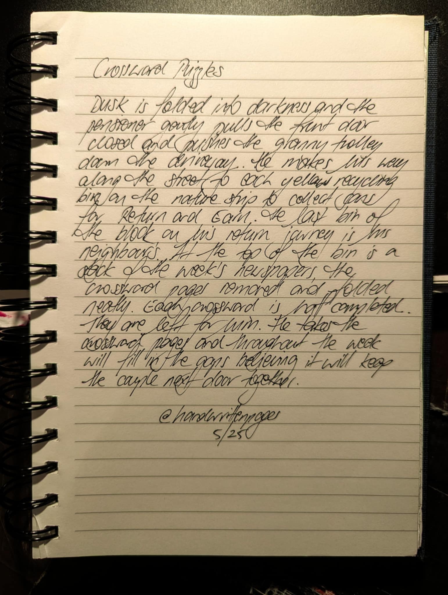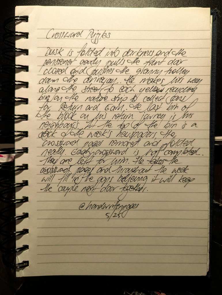 Dusk is folded into darkness and the pensioner gently pulls the front door closed and pushes the granny trolley down the driveway. He makes his way along the street to each yellow recycling bin on the nature strip to collect cans for return and earn. The last bin of the block on his return journey is his neighbours. At the top of the bin is a stack of the week’s newspapers, the crossword pages removed and folded neatly. Each crossword is half completed. They are left for him. He takes the crossword pages and throughout the week will fill in the gaps believing it will keep the couple next door together.
