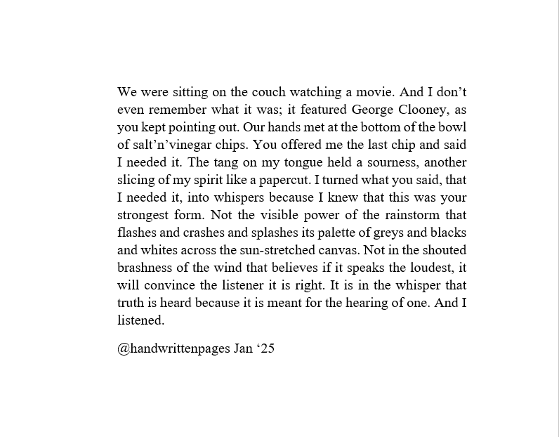 We were sitting on the couch watching a movie. And I don’t even remember what it was; it featured George Clooney, as you kept pointing out. Our hands met at the bottom of the bowl of salt’n’vinegar chips. You offered me the last chip and said I needed it. The tang on my tongue held a sourness, another slicing of my spirit like a papercut. I turned what you said, that I needed it, into whispers because I knew that this was your strongest form. Not the visible power of the rainstorm that flashes and crashes and splashes its palette of greys and blacks and whites across the sun-stretched canvas. Not in the shouted brashness of the wind that believes if it speaks the loudest, it will convince the listener it is right. It is in the whisper that truth is heard because it is meant for the hearing of one. And I listened.