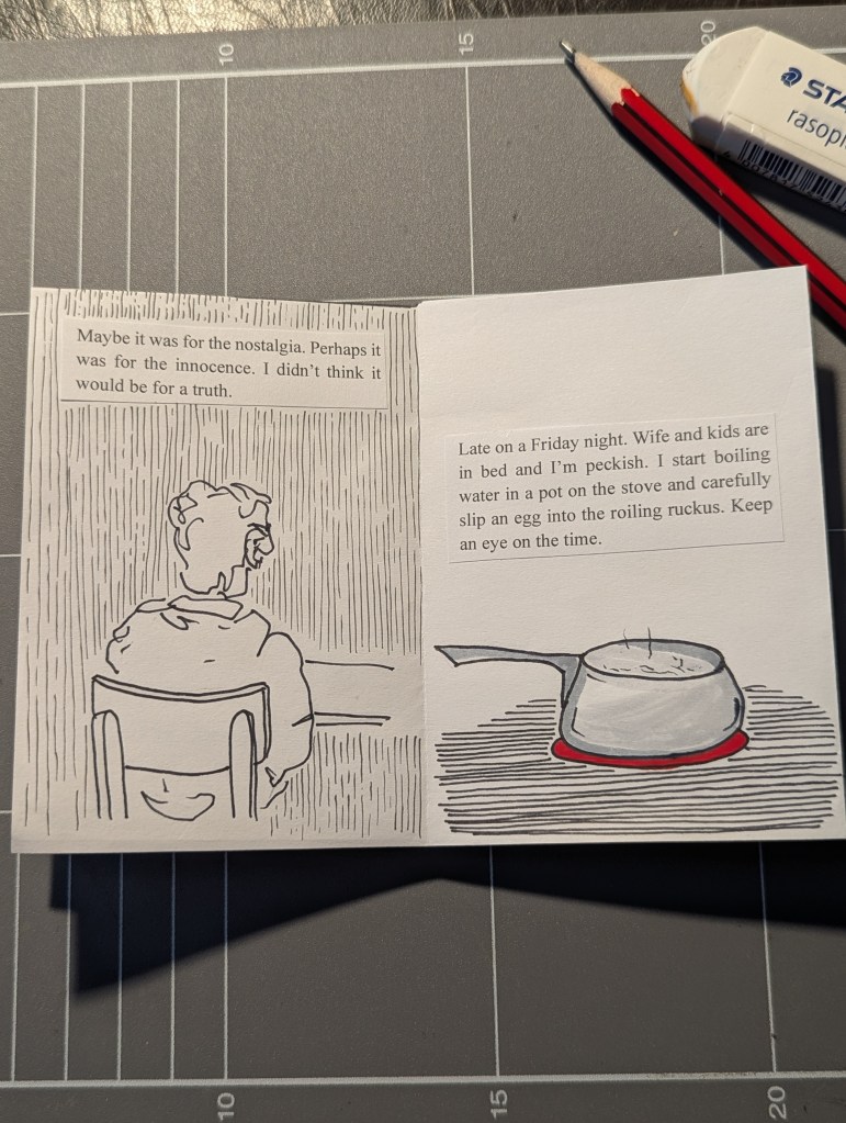 Maybe it was for the nostalgia. Perhaps it was for the innocence. I didn’t think it would be for a truth. Late on a Friday night. Wife and kids are in bed and I’m peckish. I start boiling water in a pot on the stove and carefully slip an egg into the roiling ruckus. Keep an eye on the time.