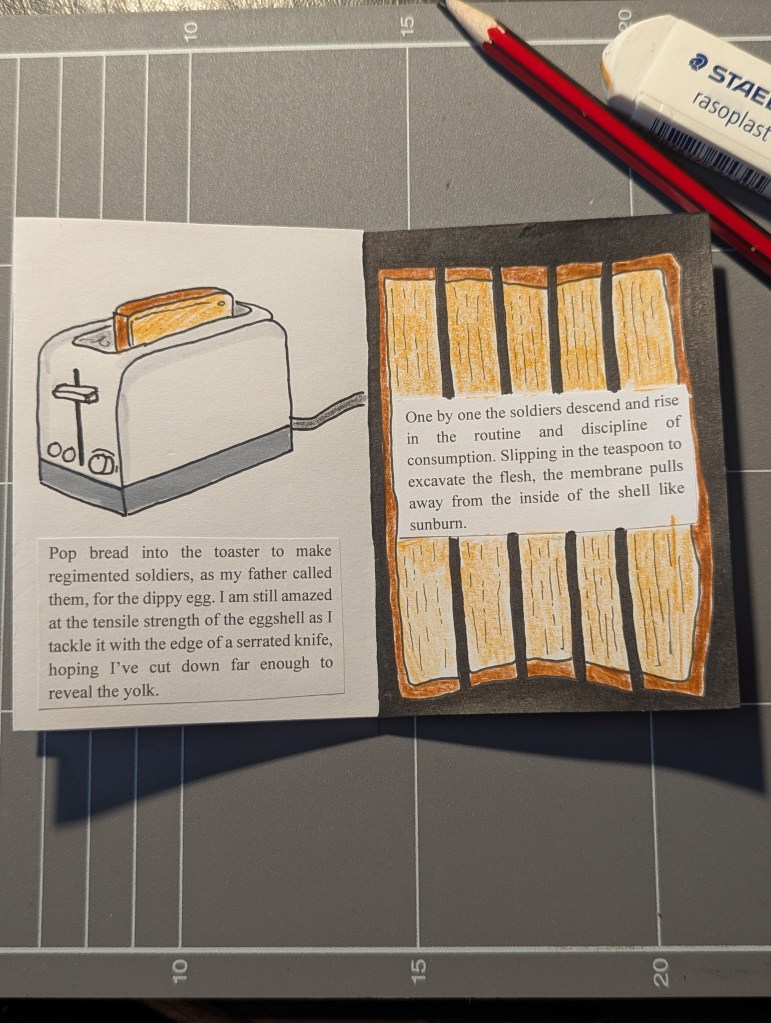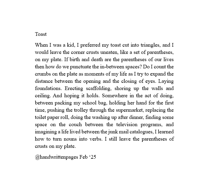 When I was a kid, I preferred my toast cut into triangles, and I would leave the corner crusts uneaten, like a set of parentheses, on my plate. If birth and death are the parentheses of our lives then how do we punctuate the in-between spaces? Do I count the crumbs on the plate as moments of my life as I try to expand the distance between the opening and the closing of eyes. Laying foundations. Erecting scaffolding, shoring up the walls and ceiling. And hoping it holds. Somewhere in the act of doing, between packing my school bag, holding her hand for the first time, pushing the trolley through the supermarket, replacing the toilet paper roll, doing the washing up after dinner, finding some space on the couch between the television programs, and imagining a life lived between the junk mail catalogues, I learned how to turn nouns into verbs. I still leave the parentheses of crusts on my plate.