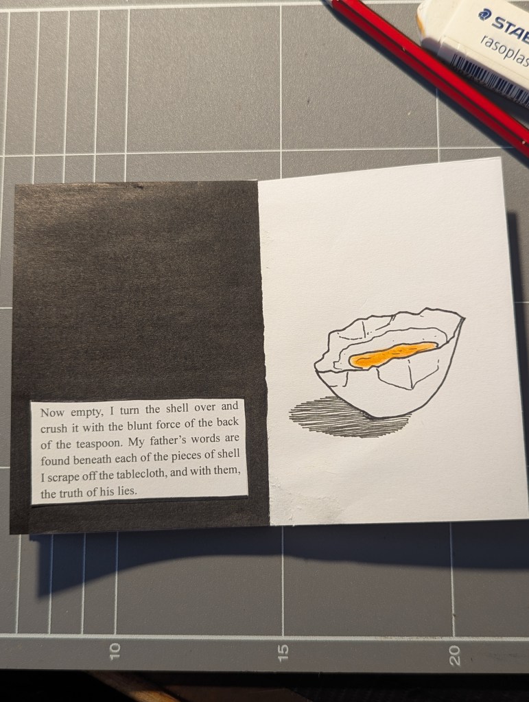 Now empty, I turn the shell over and crush it with the blunt force of the back of the teaspoon. My father’s words are found beneath each of the pieces of shell I scrape off the tablecloth, and with them, the truth of his lies.