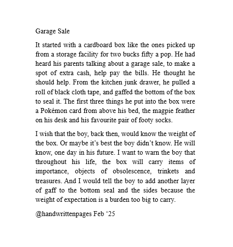 It started with a cardboard box like the ones picked up from a storage facility for two bucks fifty a pop. He had heard his parents talking about a garage sale, to make a spot of extra cash, help pay the bills. He thought he should help. From the kitchen junk drawer, he pulled a roll of black cloth tape, and gaffed the bottom of the box to seal it. The first three things he put into the box were a Pokémon card from above his bed, the magpie feather on his desk and his favourite pair of footy socks.