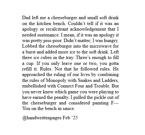 Dad left me a cheeseburger and small soft drink on the kitchen bench. Couldn’t tell if it was an apology or recalcitrant acknowledgement that I needed sustenance. I mean, if it was an apology it was pretty piss-poor. Didn’t matter; I was hungry. Lobbed the cheeseburger into the microwave for a burst and added more ice to the soft drink. Left three ice cubes in the tray. Three’s enough to fill a cup. If you only leave one or two, you gotta refill it. Rules. Not that he followed rules. He approached the ruling of our lives by combining the rules of Monopoly with Snakes and Ladders, embellished with Connect Four and Trouble. But you never knew which game you were playing to have earned the penalty. I pulled the pickle out of the cheeseburger and considered painting F— You on the bench in sauce.