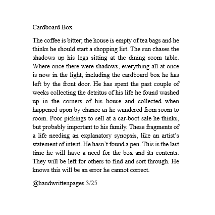 The coffee is bitter; the house is empty of tea bags and he thinks he should start a shopping list. The sun chases the shadows up his legs sitting at the dining room table. Where once there were shadows, everything all at once is now in the light, including the cardboard box he has left by the front door. He has spent the past couple of weeks collecting the detritus of his life he found washed up in the corners of his house and collected when happened upon by chance as he wandered from room to room. Poor pickings to sell at a car-boot sale he thinks, but probably important to his family. These fragments of a life needing an explanatory synopsis, like an artist’s statement of intent. He hasn’t found a pen. This is the last time he will have a need for the box and its contents. They will be left for others to find and sort through. He knows this will be an error he cannot correct.