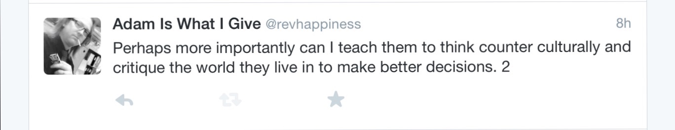 I see my students consuming the pop of Katy Perry, Rihanna, Kanye; the sexual mores of Sex and The City, Girls, Modern Family. Where will they be in their middle age after feasting on the values of modern pop culture?