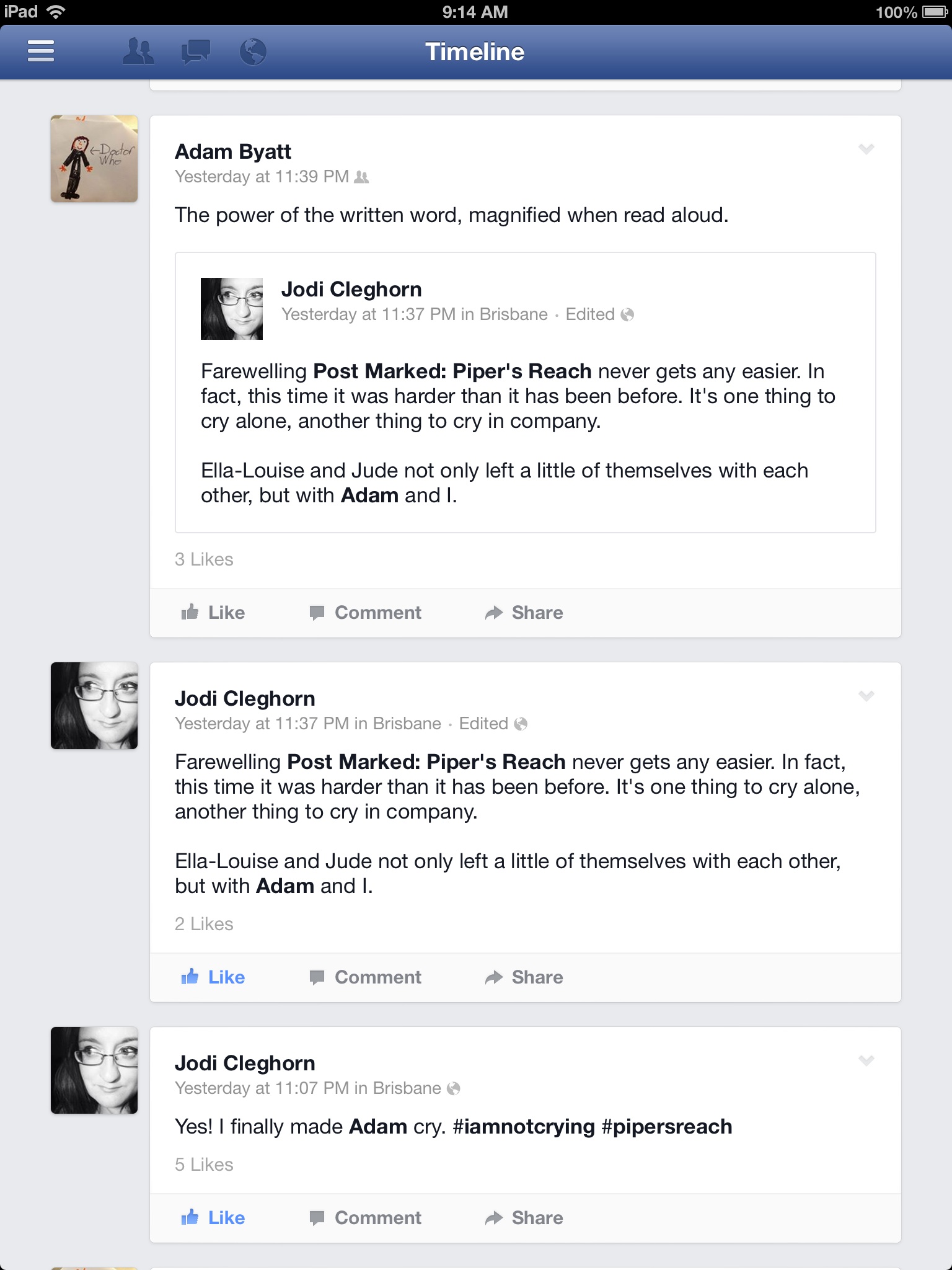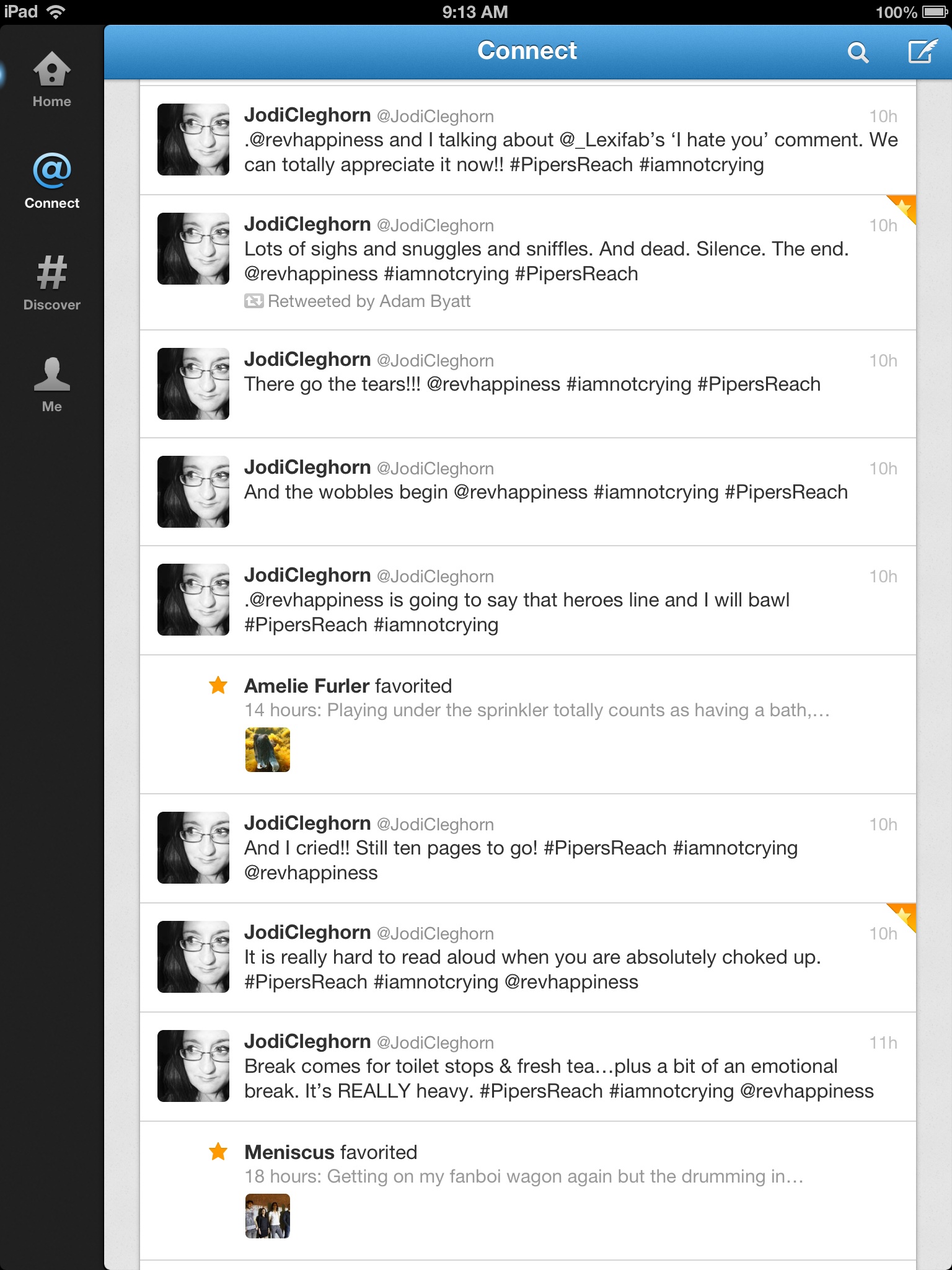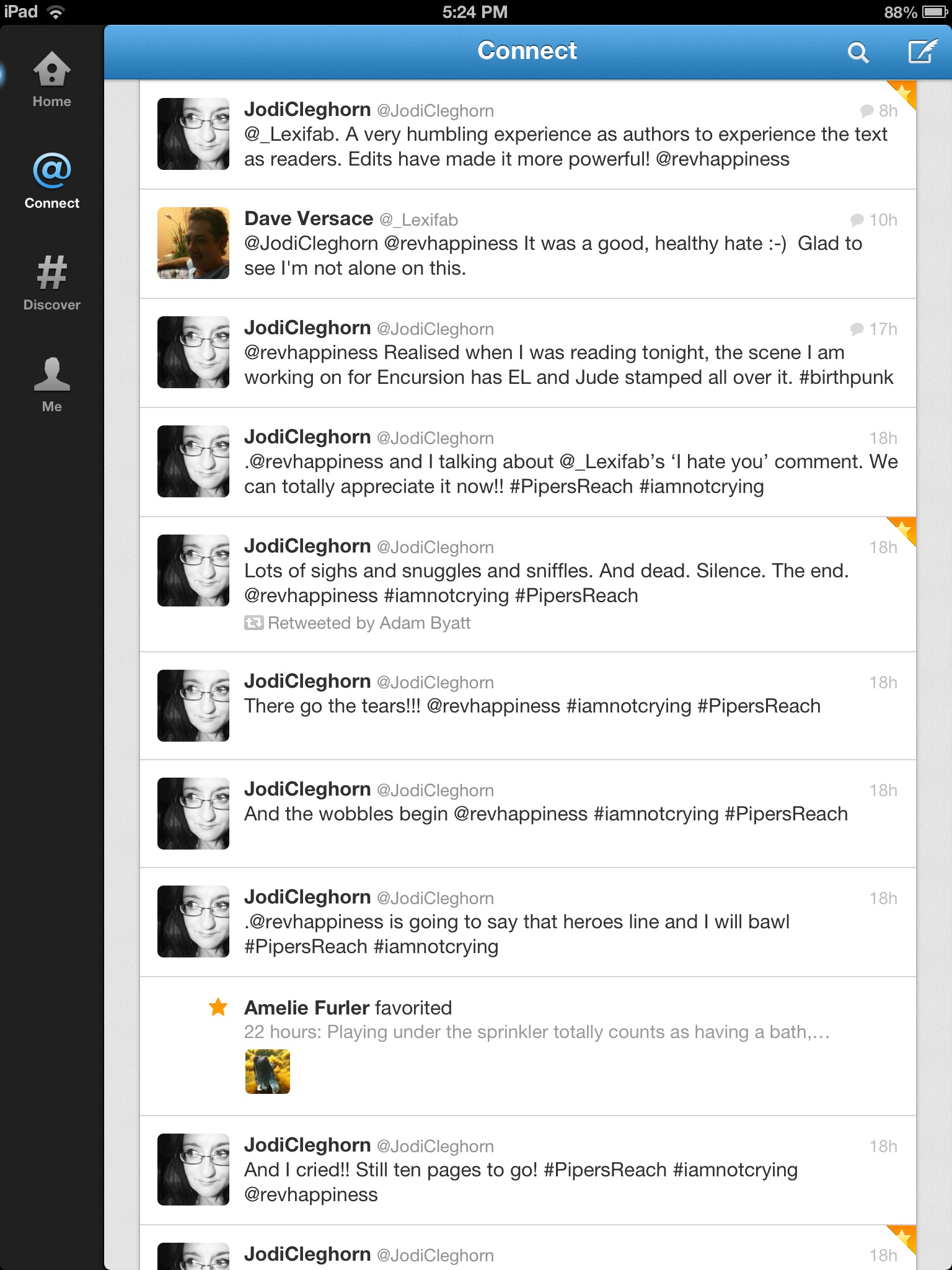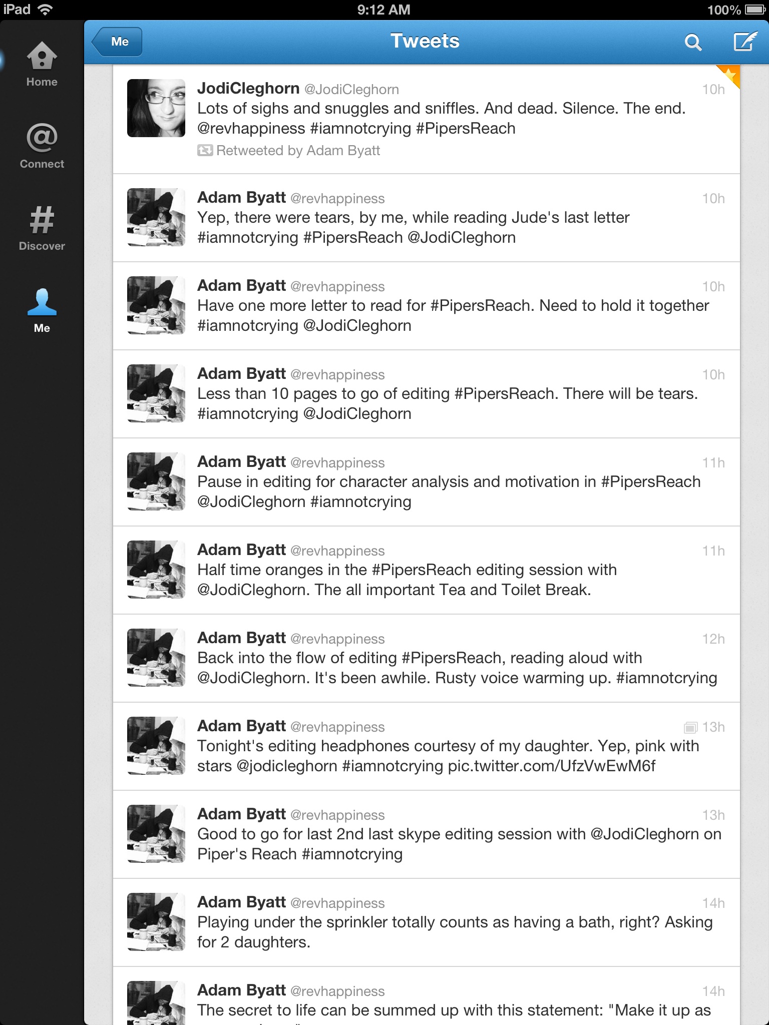 Below is a couple of screen shots from my twitter feed (you will need to read the feed from the bottom up). You can see I was beginning to lose it when I said there were 10 pages to go. The emotion was threatening to overflow and I could hear Jodi begin to lose it a little.