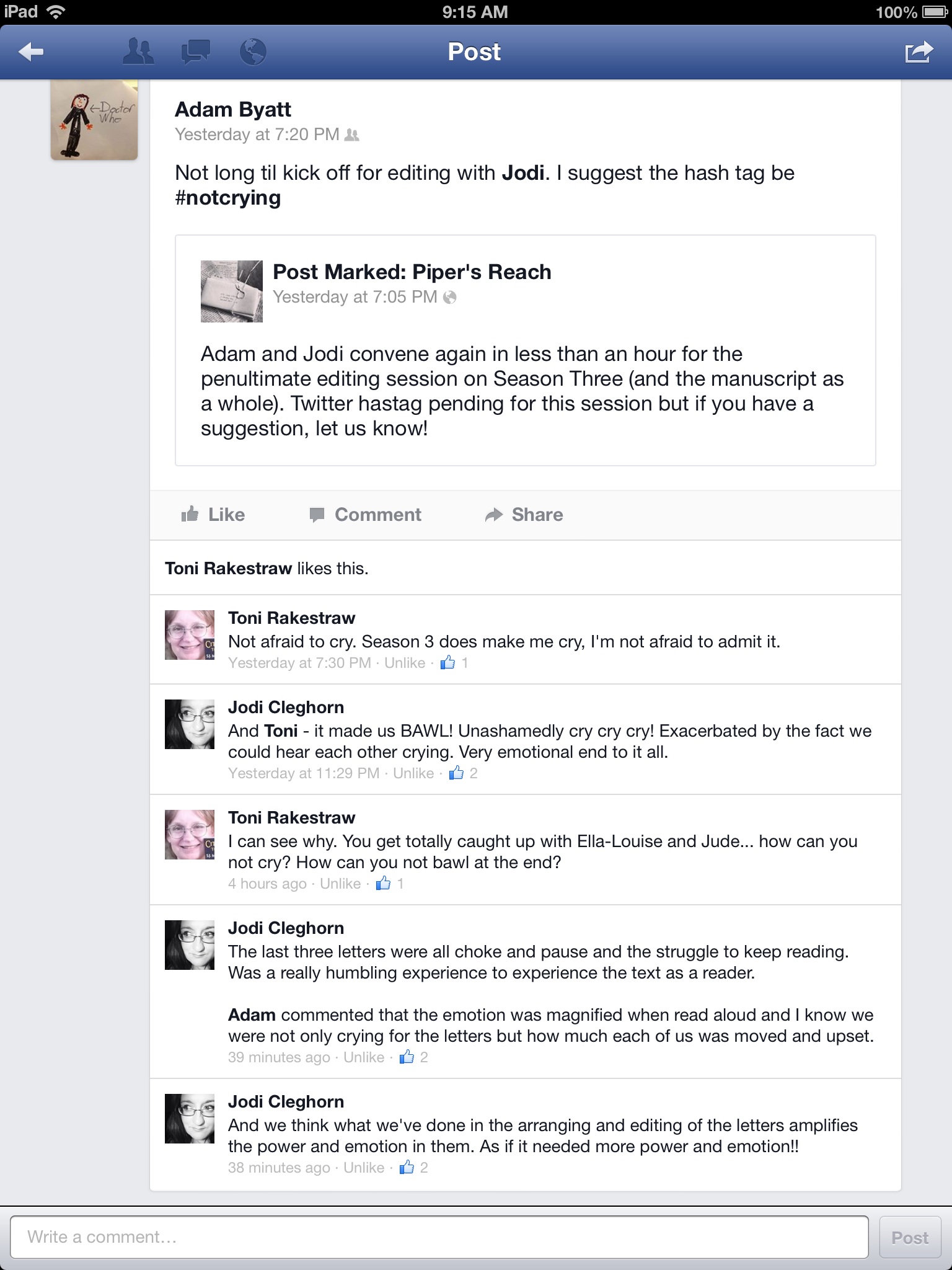 Last night my collaborative writing partner, Jodi Cleghorn, and I sat down via Skype to put the final pages of our novel, Post Marked: Piper’s Reach through the edits.