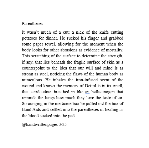 Parentheses It wasn’t much of a cut; a nick of the knife cutting potatoes for dinner. He sucked his finger and grabbed some paper towel, allowing for the moment when the body looks for other abrasions as evidence of mortality. This scratching of the surface to determine the strength, if any, that lies beneath the fragile surface of skin as a counterpoint to the idea that our will and mind is as strong as steel, noticing the flaws of the human body as miraculous. He inhales the iron-infused scent of the wound and knows the memory of Dettol is in its smell, that acrid odour breathed in like an hallucinogen that reminds the lungs how much they love the taste of air. Scrounging in the medicine box he pulled out the box of Band Aids and settled into the parentheses of healing as the blood soaked into the pad.