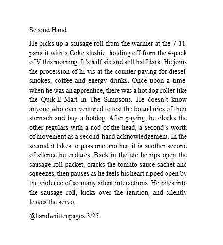 He picks up a sausage roll from the warmer at the 7-11, pairs it with a Coke slushie, holding off from the 4-pack of V this morning. It’s half six and still half dark. He joins the procession of hi-vis at the counter paying for diesel, smokes, coffee and energy drinks. Once upon a time, when he was an apprentice, there was a hot dog roller like the Quik-E-Mart in The Simpsons. He doesn’t know anyone who ever ventured to test the boundaries of their stomach and buy a hotdog. After paying, he clocks the other regulars with a nod of the head, a second’s worth of movement as a second-hand acknowledgement. In the second it takes to pass one another, it is another second of silence he endures. Back in the ute he rips open the sausage roll packet, cracks the tomato sauce sachet and squeezes, then pauses as he feels his heart ripped open by the violence of so many silent interactions. He bites into the sausage roll, kicks over the ignition, and silently leaves the servo.