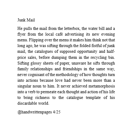 He pulls the mail from the letterbox, the water bill and a flyer from the local café advertising its new evening menu. Flipping over the menu it makes him think not that long ago, he was sifting through the folded fistful of junk mail, the catalogues of supposed opportunity and half-price sales, before dumping them in the recycling bin. Sifting glossy sheets of paper, unaware he sifts through family relationships and friendships in the same way, never cognisant of the methodology of how thoughts turn into actions because love had never been more than a singular noun to him. It never achieved metamorphosis into a verb to permeate each thought and action of his life to bring richness to the catalogue template of his discardable world.