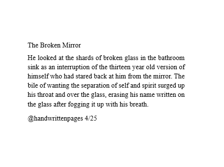 He looked at the shards of broken glass in the bathroom sink as an interruption of the thirteen year old version of himself who had stared back at him from the mirror. The bile of wanting the separation of self and spirit surged up his throat and over the glass, erasing his name written on the glass after fogging it up with his breath.