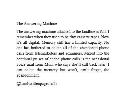 The answering machine attached to the landline is full. I remember when they used to be tiny cassette tapes. Now it’s all digital. Memory still has a limited capacity. No one has bothered to delete all of the abandoned phone calls from telemarketers and scammers. Mixed into the continual pulses of ended phone calls is the occasional voice mail from Mum who says she’ll call back later. I can delete the memory but won’t, can’t forget, the abandonment.