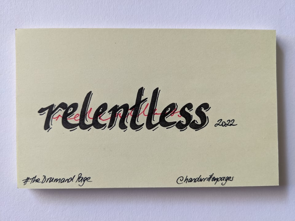 It’s a word to apply to my creative life through writing and drawing, and will have application to the spiritual, emotional/mental, and physical aspects of my life. I don’t know what the final outcome will be at the end of 2022. I may have made no progress other than developing my creative practice. I may have opportunities to explore because I asked about a collaboration, or I put in an application for a writing mentorship, or I submitted work for publication and only received rejections. I don’t know. But I will be relentless in my pursuit of this creative life.