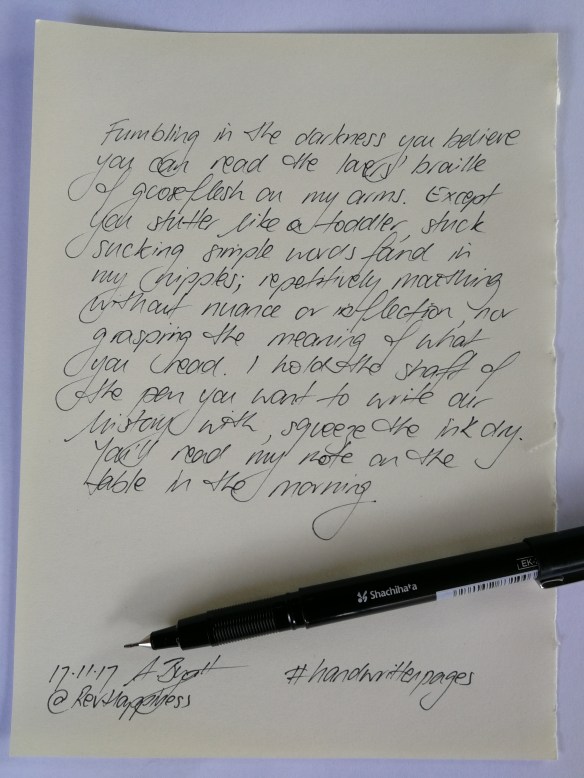 Fumbling in the darkness you believe you can read the lovers’ braille of gooseflesh on my arms. Except you stutter like a toddler, stuck sucking simple words found in my nipples; repetitively mouthing without nuance or inflection, nor grasping the meaning of what you read. I hold the shaft of the pen you want to write our history with, squeeze the ink dry. You’ll read my note on the table in the morning.