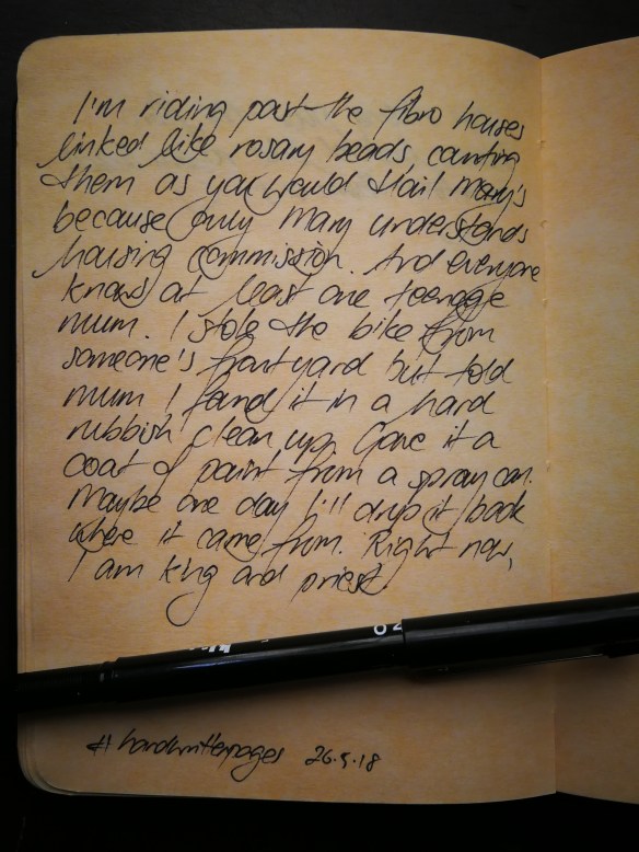 I’m riding past the fibro houses linked like rosary beads, counting them as you would Hail Marys because only Mary understands housing commission. And everyone knows at least one teenage mum. I stole the bike from someone’s front yard but told mum I found it in a hard rubbish clean up. Gave it a coat of paint from a spray can. Maybe one day I’ll drop it back where it came from. Right now, I am king and priest.