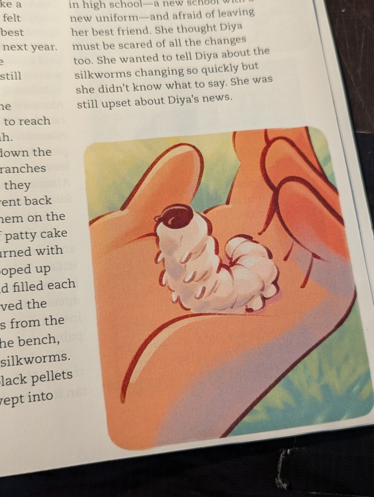 A Shoebox of Changes is the story of Alannah and her best friend Diya, who find out they won’t be attending the same high school in the new year. The extended metaphor running through the story is the shoebox of silkworms Alannah is taking care of, from their hatching through to their growth, spinning silk coccoons and their metamorphosis into moths, as representative of the changes we go through in life.